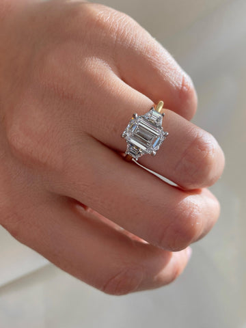 2.6 CT Emerald Shaped Moissanite Engagement Ring In Three Stone Design